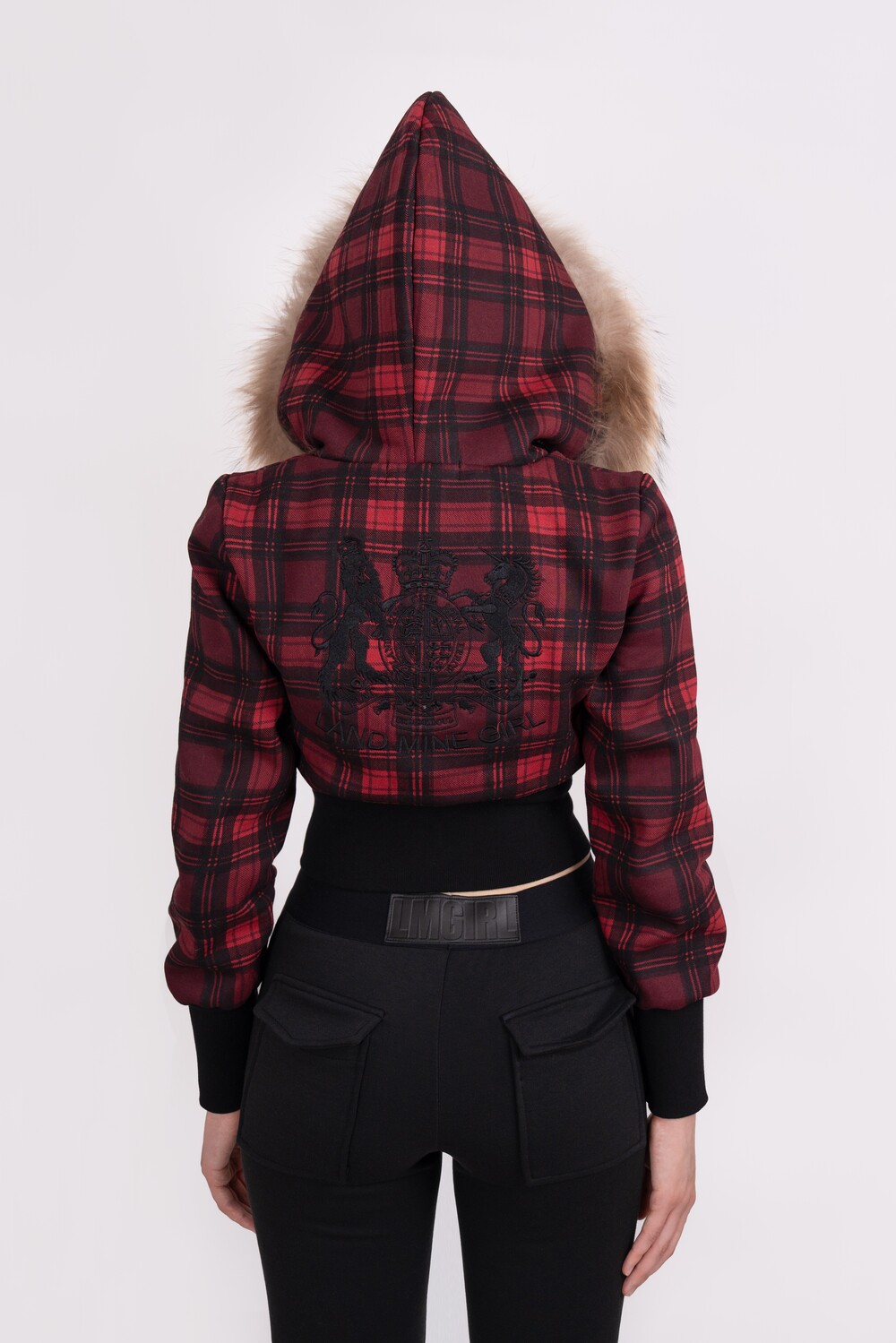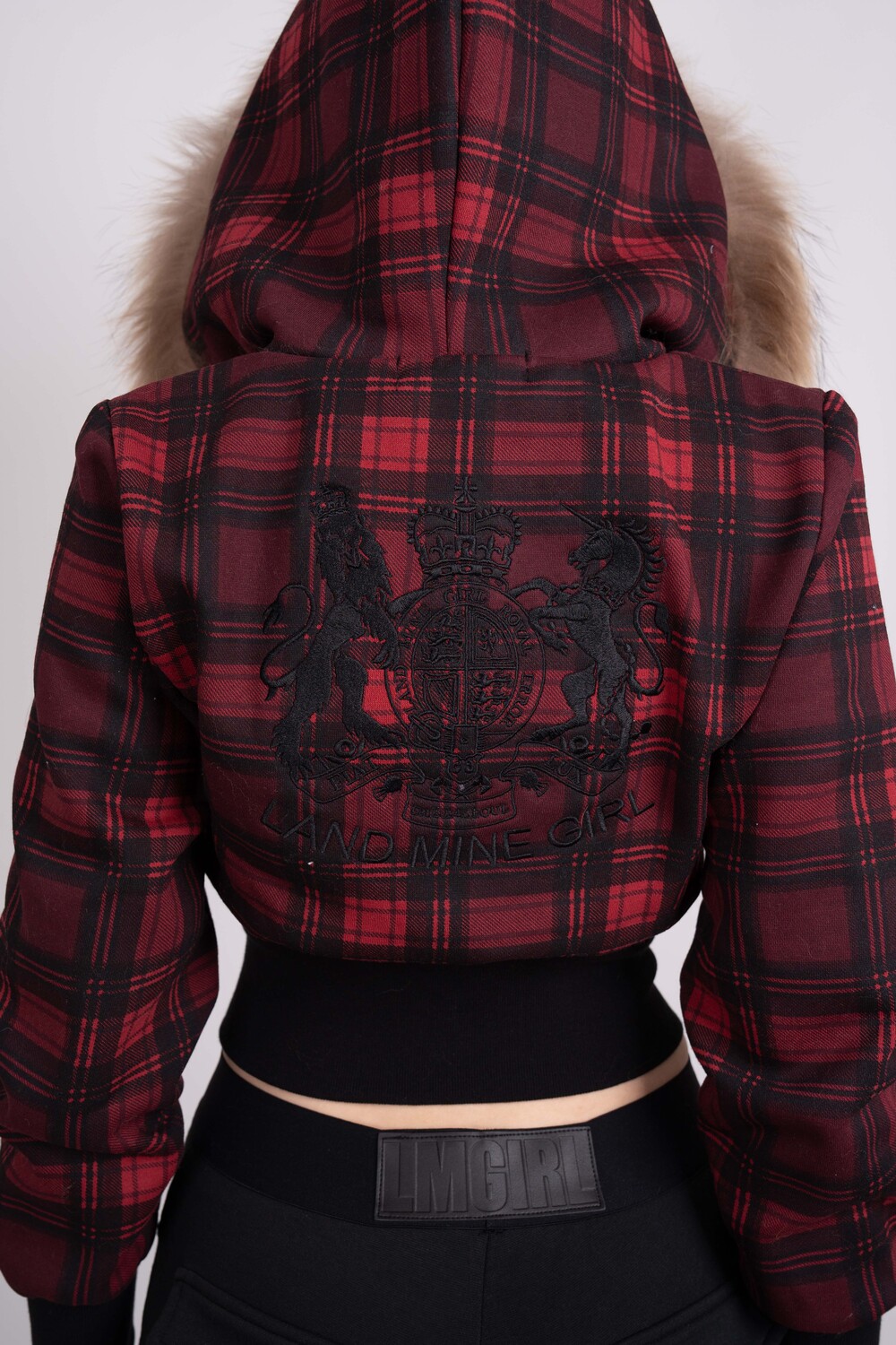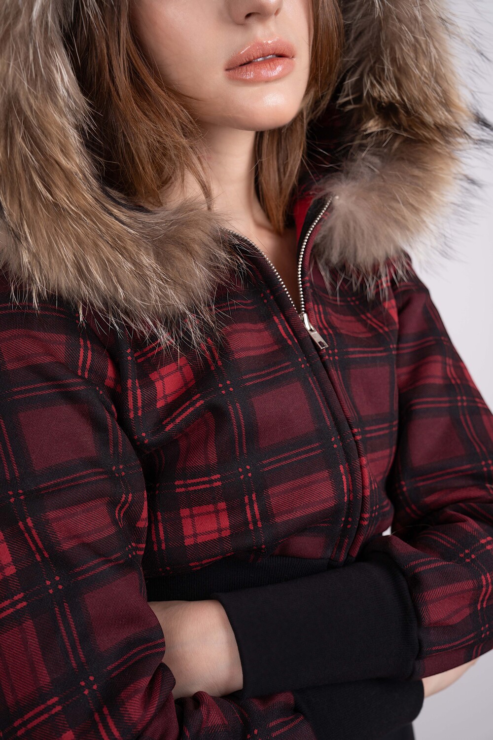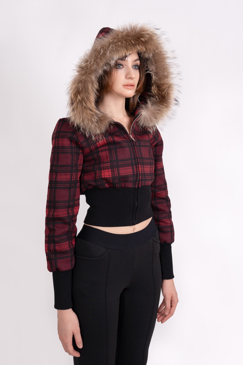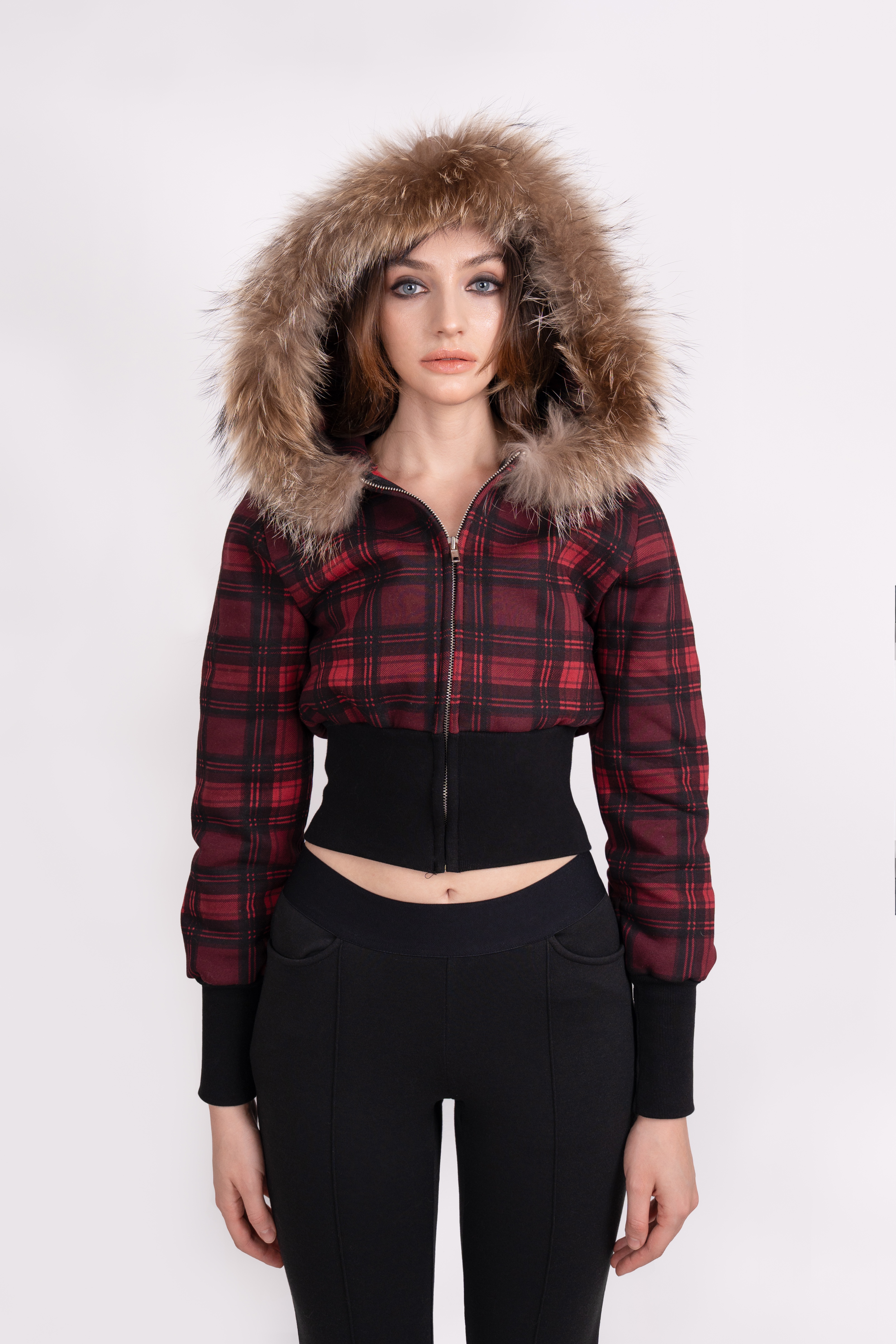 Tony Faux Fur Trimming cropped Hoodie (RED PLAID)